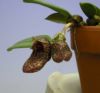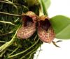 【品種の説明】 スリッパのような黒い花を並べてつける。