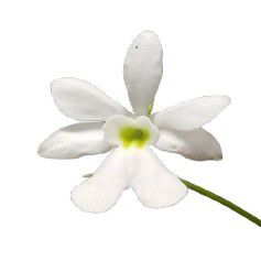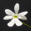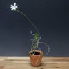 【品種の説明】 マダガスカル産で湿度を好む小型の白い花。花は3cm前後。小型で咲く。花は葉の付け根から細長い茎をのばし先端に1輪つける。